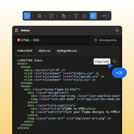Anima turns your Figma designs into clean, production-ready code - React, HTML, Tailwind, and more. You can then start on-brand vibe coding instantly, using your own design system.