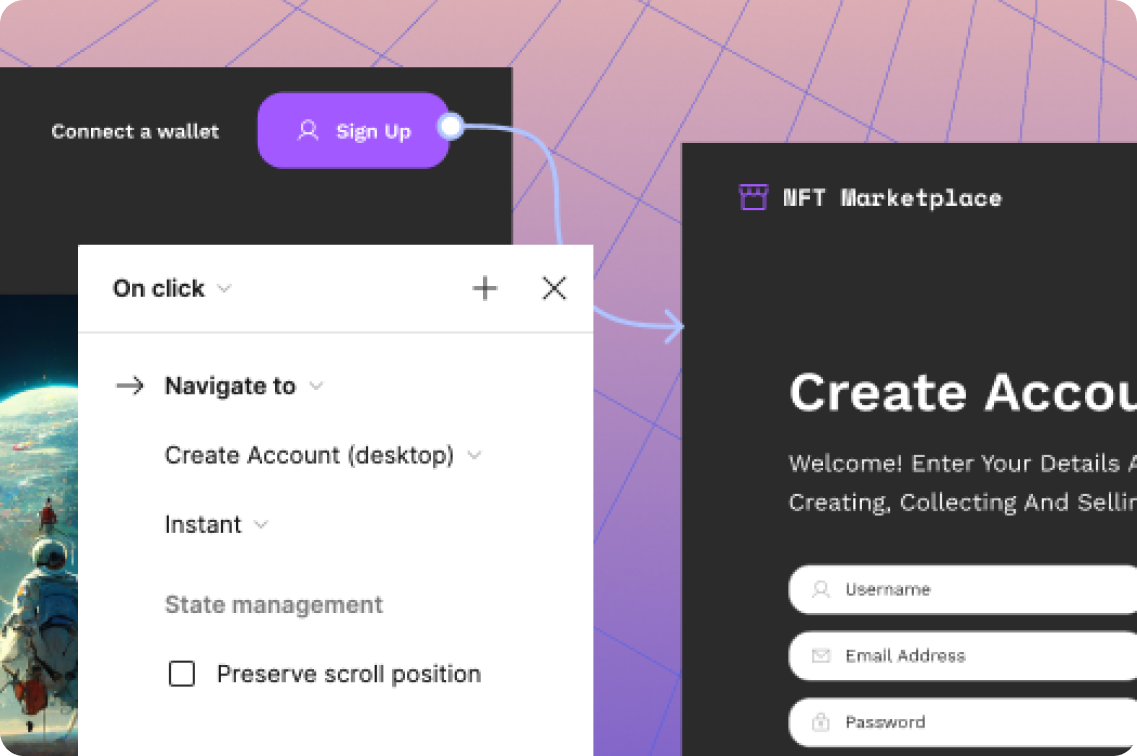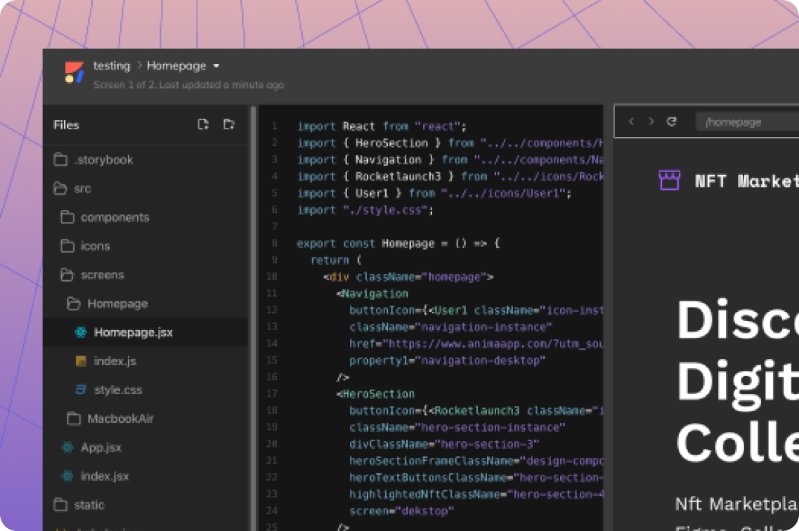 Transform complete Figma files into a fully functional web application, from navigational features to detailed component interactions.