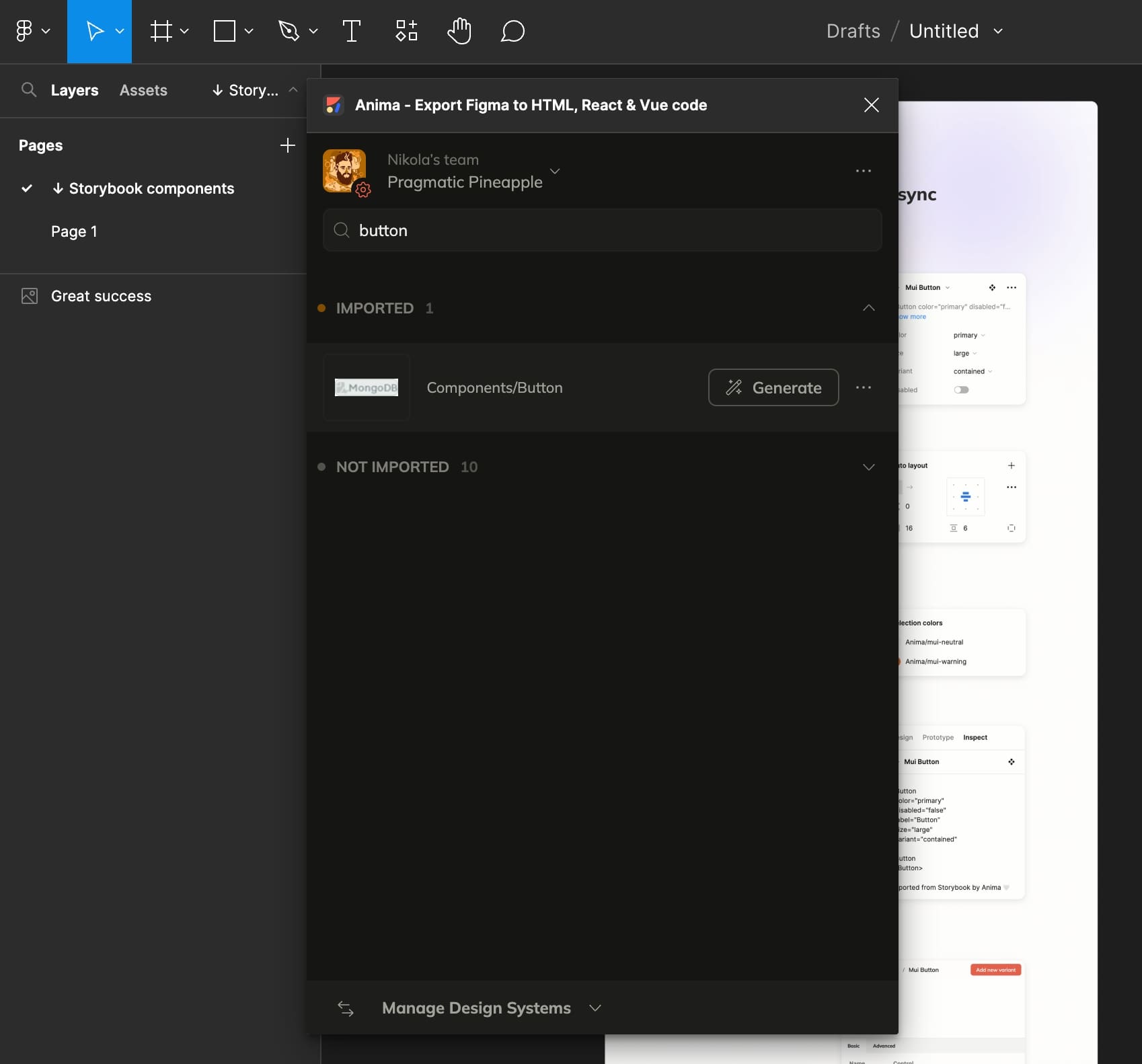 When the import is finished in the plugin, we can go ahead and click “Generate” next to the Button component: