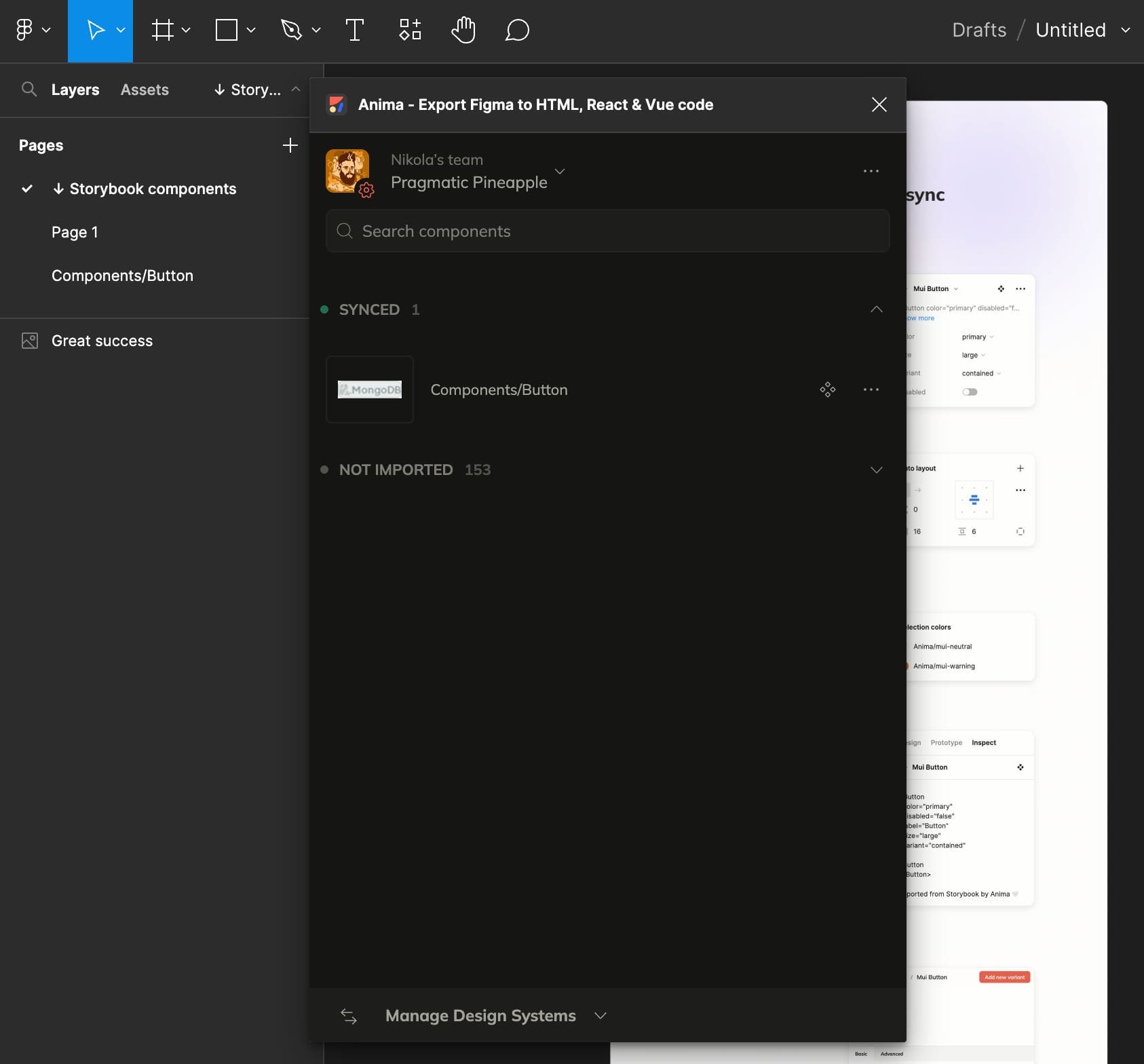 Now that the Storybook and Figma are synced via Anima’s CLI, we can generate any Storybook component right from Figma. Unimported Storybook components will appear in the Anima plugin like so: