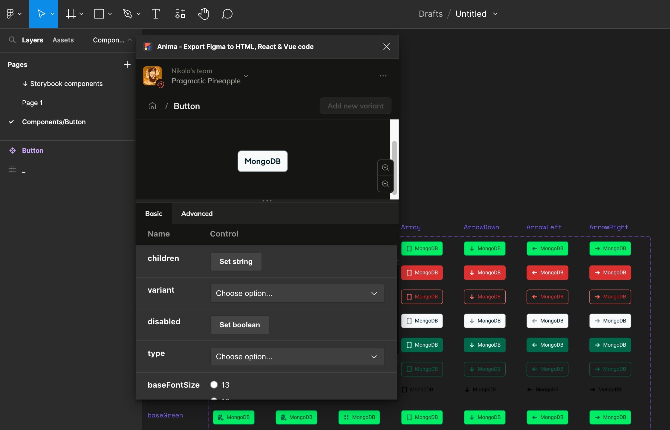 Then, we’ll select the Button variants we wish to import. In this case, ‘Button’ has a lot of props, and Anima can identify and generate every possible combination as a unique variant in Figma: