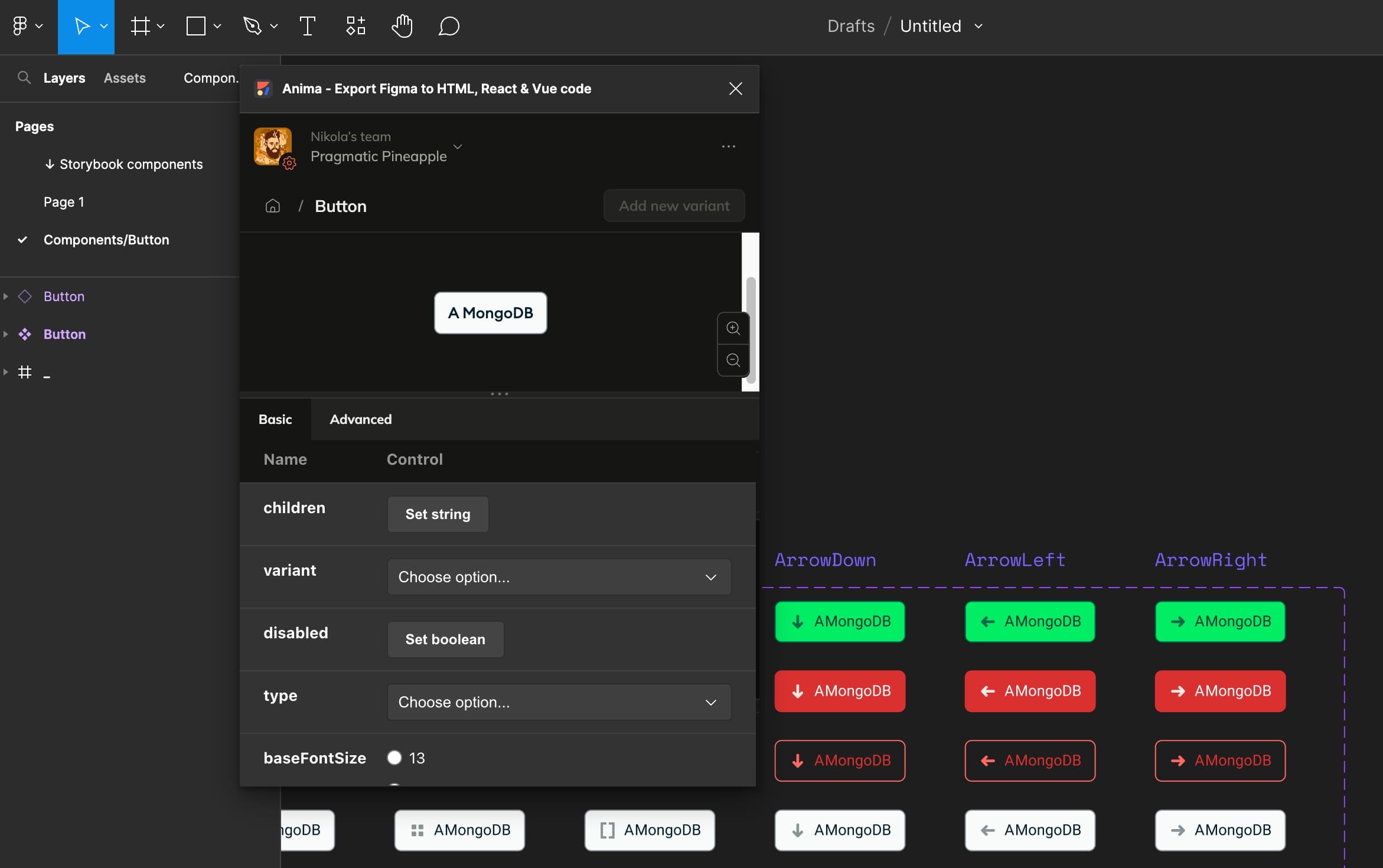 Anima will generate a separate page in Figma with all of the Button component variants, as demonstrated below: