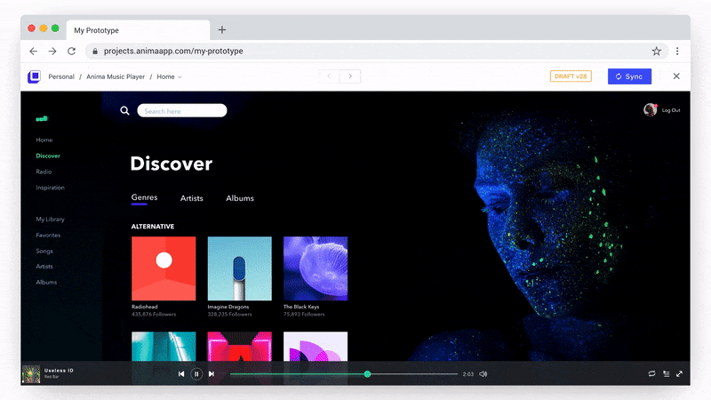 This Music Player prototype was created completely in Sketch with Anima. No developers were harmed or otherwise involved in the process.
