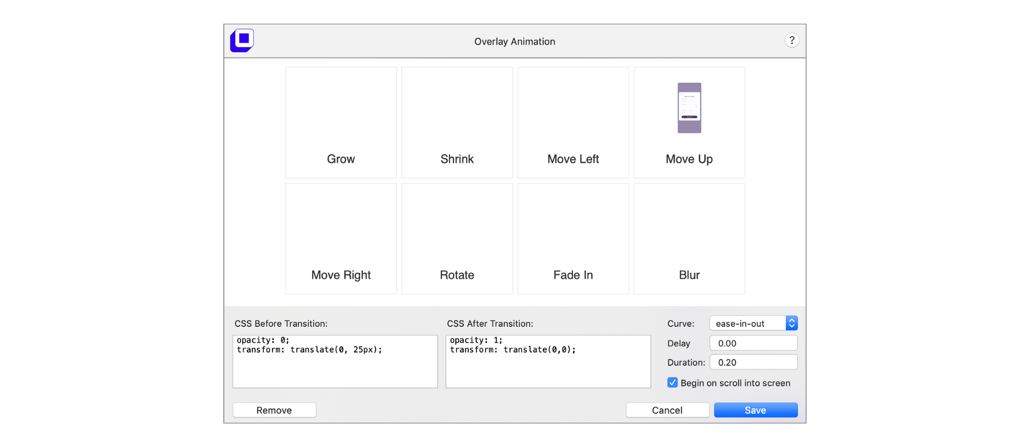 - Click ‘Edit Transition’ to customize the animation between the two artboards. You can control the Direction, Duration, Delay and Curve.