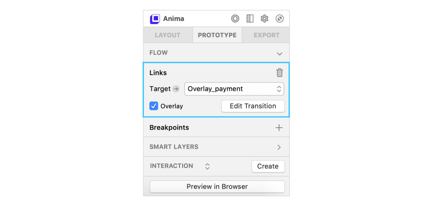 - Click Prototype tab > Flow > Links > Connect it to the Overlay artboard