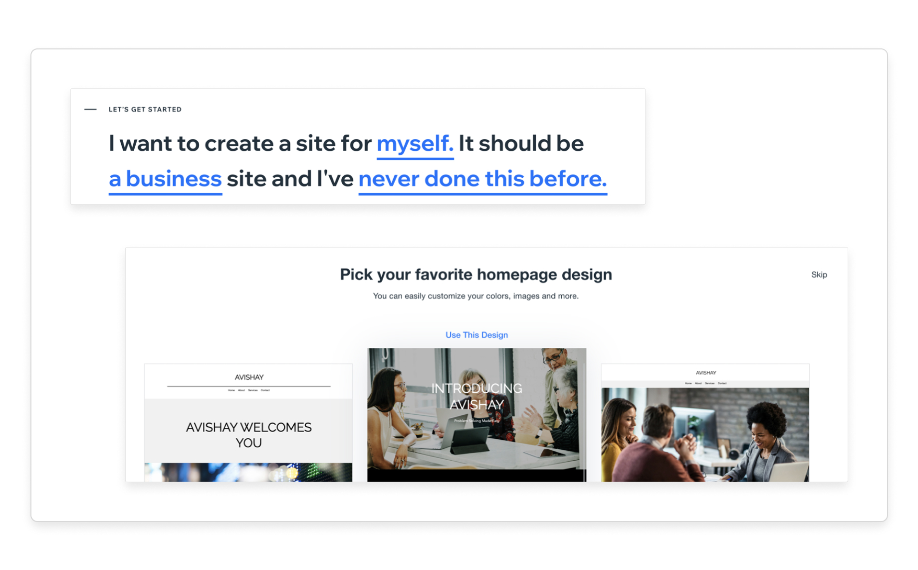 Example #1: Wix allows any small business to create its presence online. When you sign up, you’re asked three simple questions: