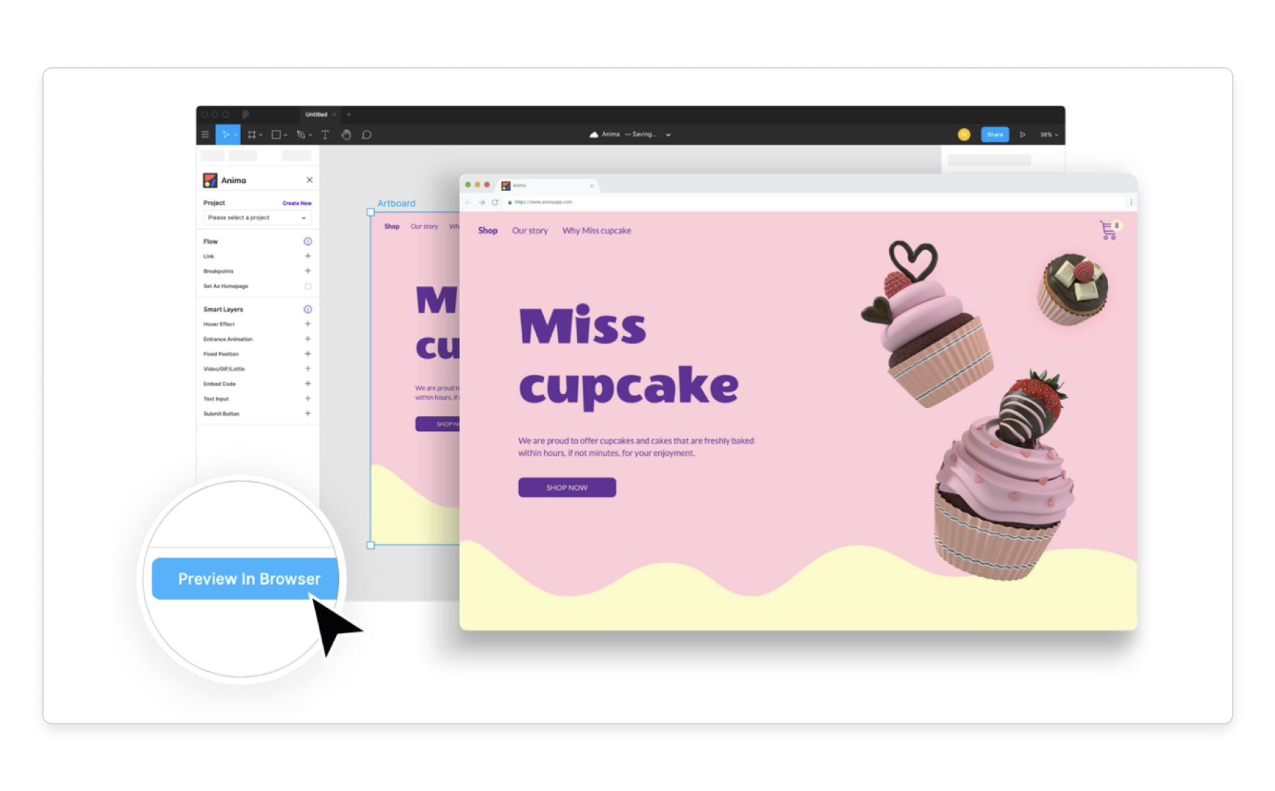 Example #3 Anima. Here at Anima, we convert design into code. In order to have the shortest time to value, we allow designers to click a button in their design tool, and within seconds they see HTML code running in the browser with their creations.