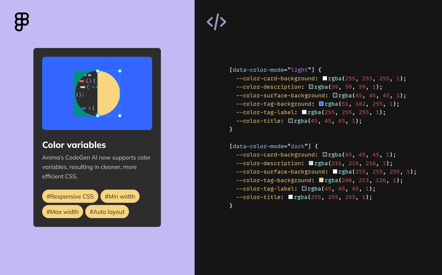 - Code Components & Screens Generation: With variables defined in Figma, Anima enables seamless translation into code components and screens that use CSS variables correctly.