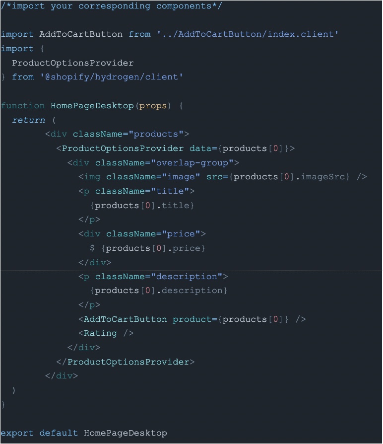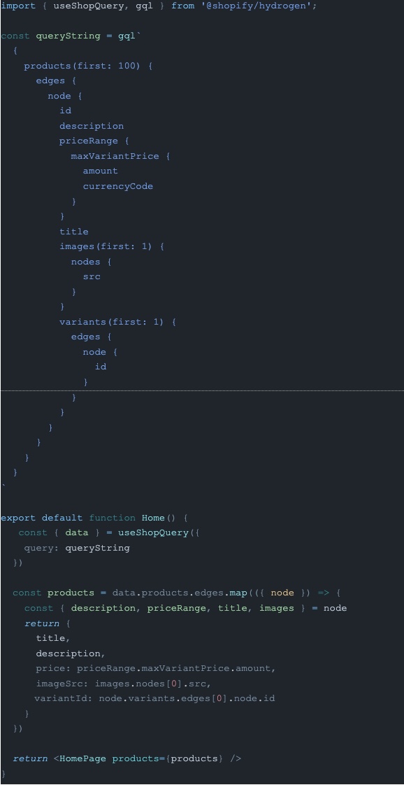 Now in the HomePage you can use the products array for rendering each product card with the actual data from the Shopify store.