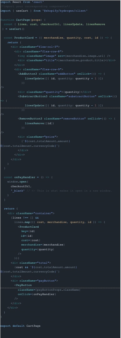 - On the Cart Page we import the useCart hook from @shopify/hydrogen/client and render each selected product from the lines property (for more info check out this tutorial) then we display the total cost of the cart and add the checkoutUrl to the pay button:
