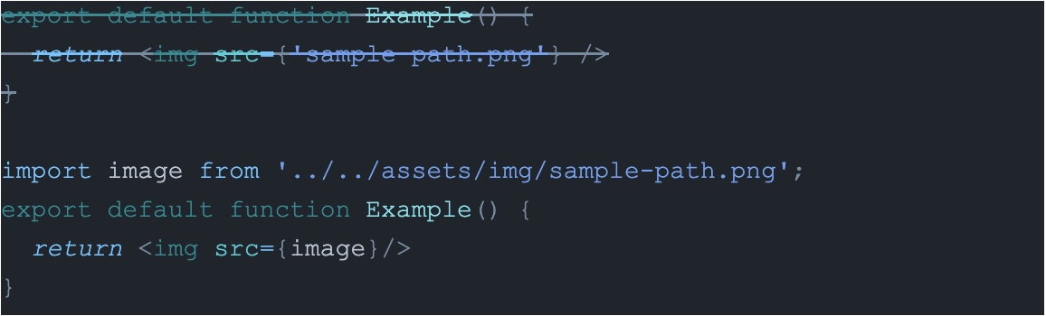 If the component has an image, replace the image source with a variable declared at the top of the file on an import statement (if path is specified by a prop then remove that prop and set the path based on the variable at the constants folder):