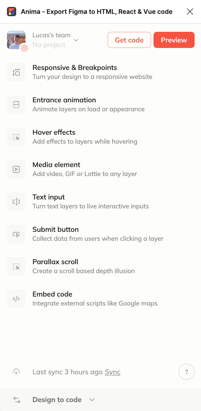 Anima allows you to transform your Figma project into a live preview or prototype that’s rendered from your actual production code. You first need to launch and sign into Anima’s plugin for Figma, and choose “Turn Design to Code” option.