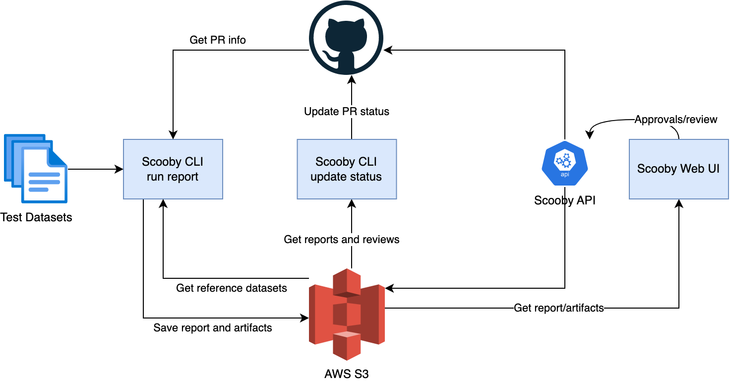 Scooby uses AWS S3 to store artifacts. Here is a high-level diagram of the Scooby architecture: