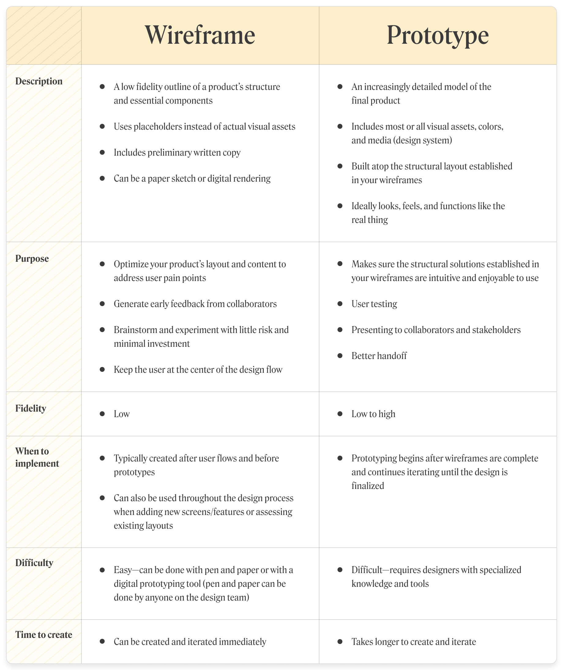 Now that we’ve established the independent roles of wireframes and prototypes, let’s take a closer look at how they’re different—and how they work together. Consider the following analogy: